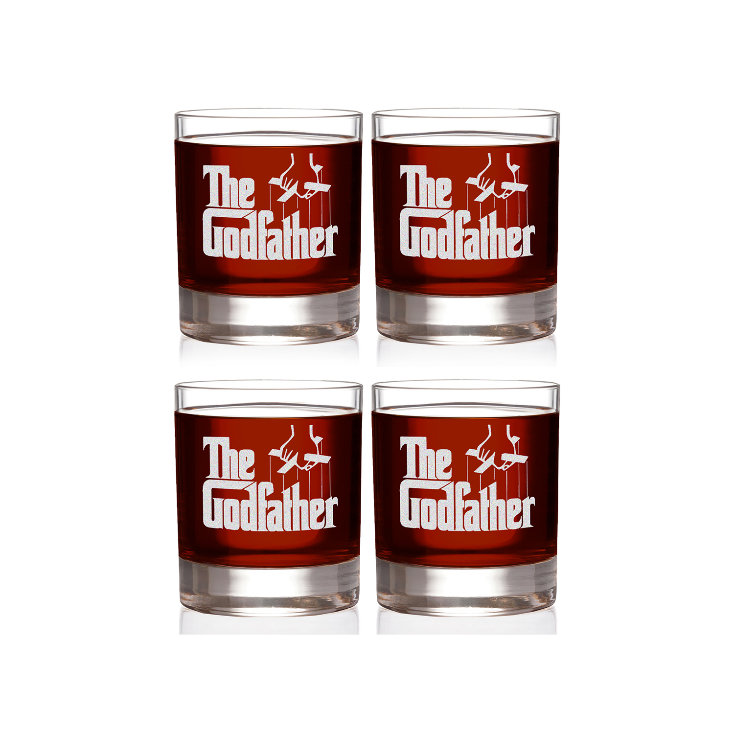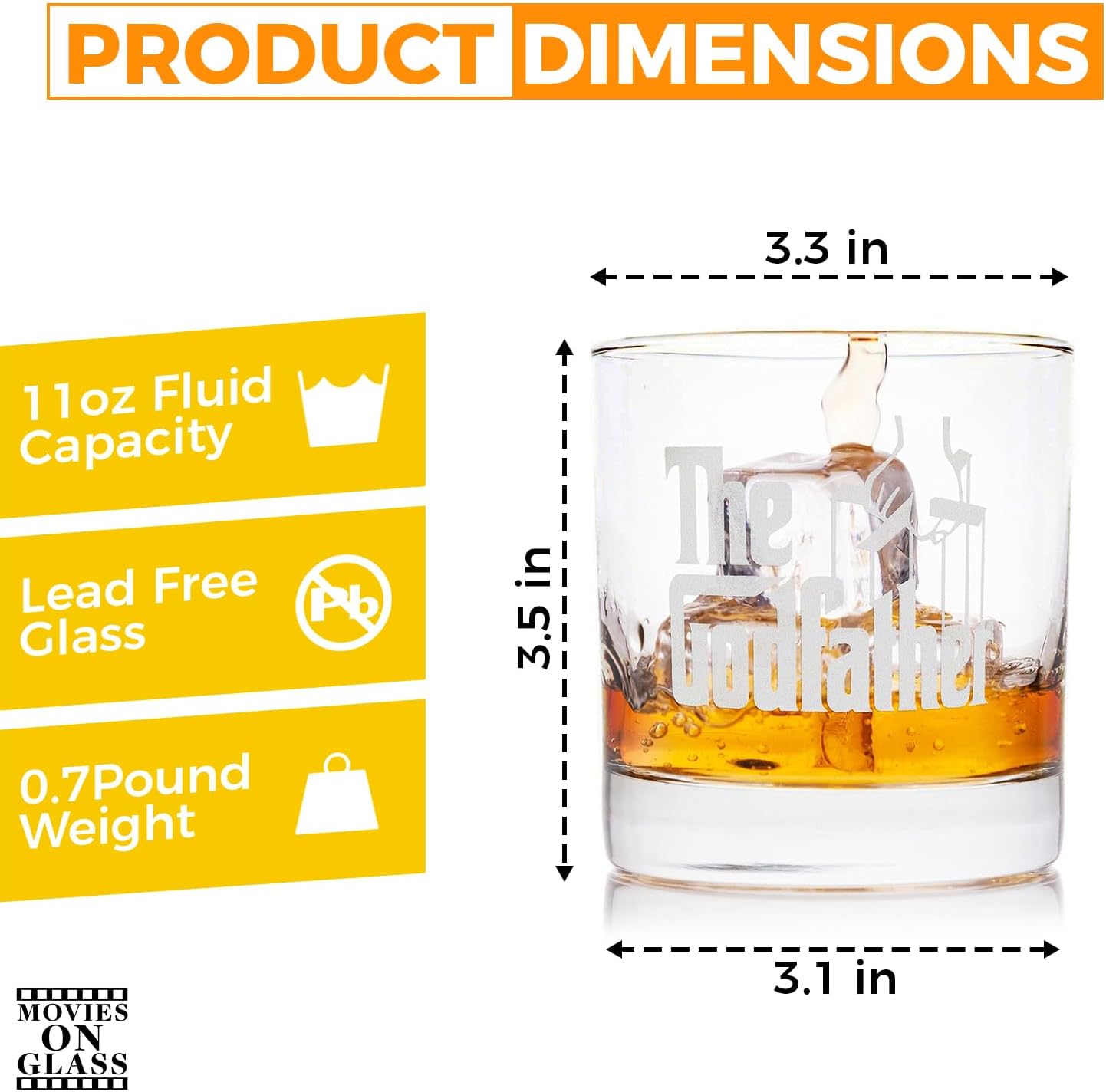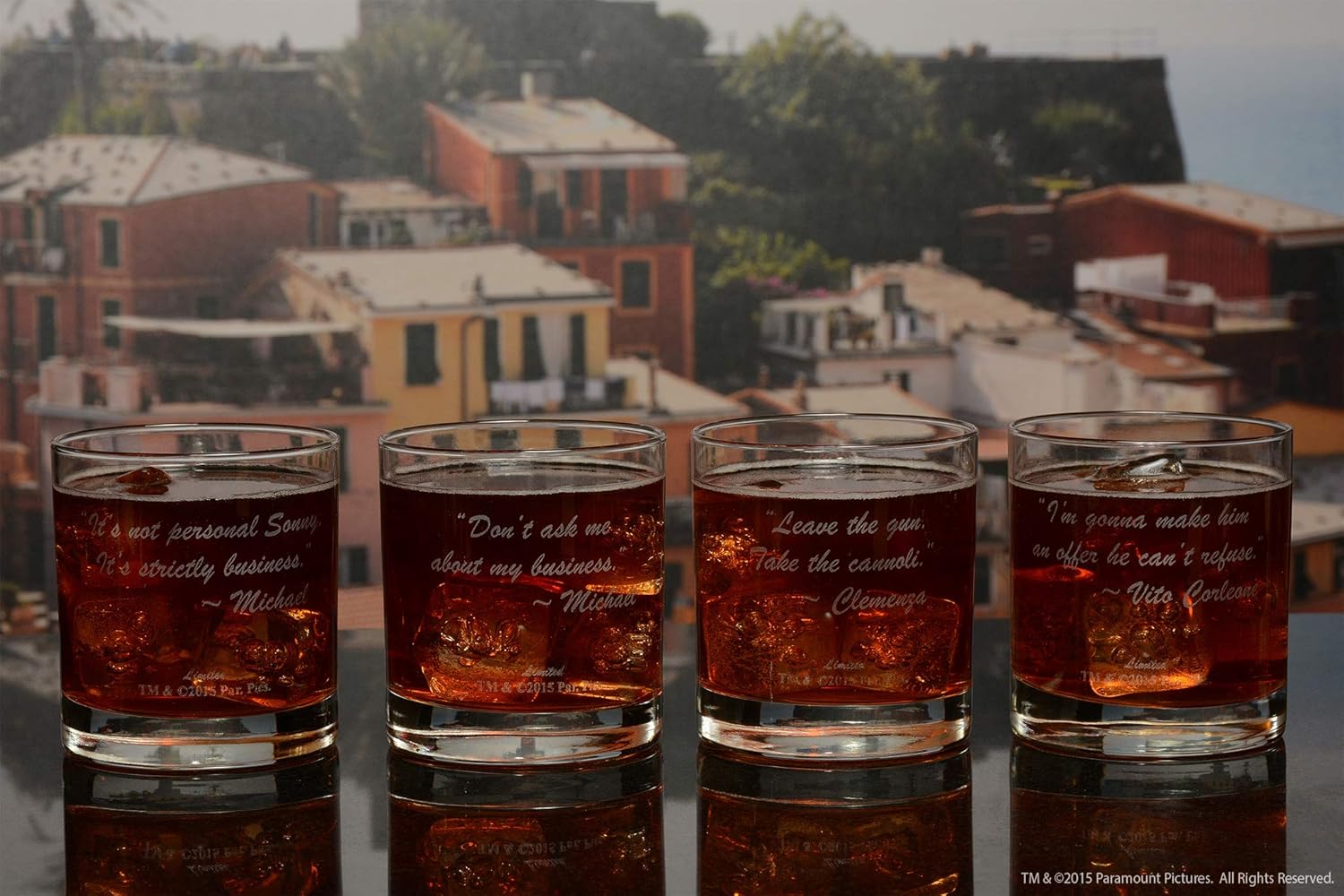 - THE GODFATHER THEMED COLLECTIBLE: Our rocks glass set features the iconic THE GODFATHER logo on the front & 4 unique quotes etched on the back of glasses. This custom whiskey glass set captures the essence of the film, making it a functional homage for enthusiasts who seek a unique addition to their collection