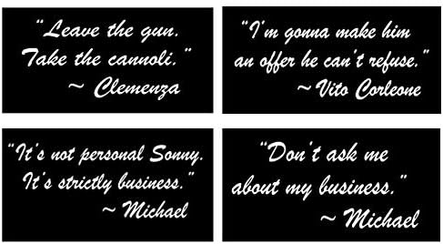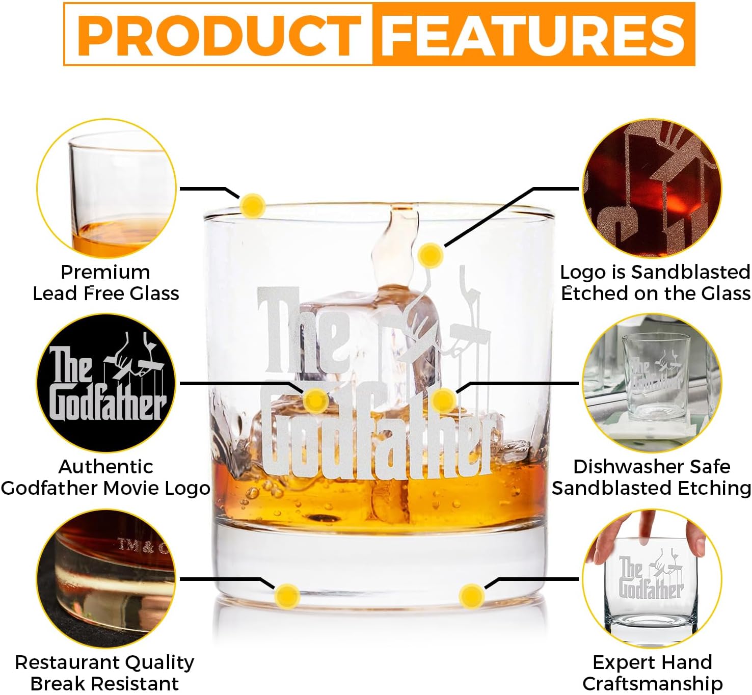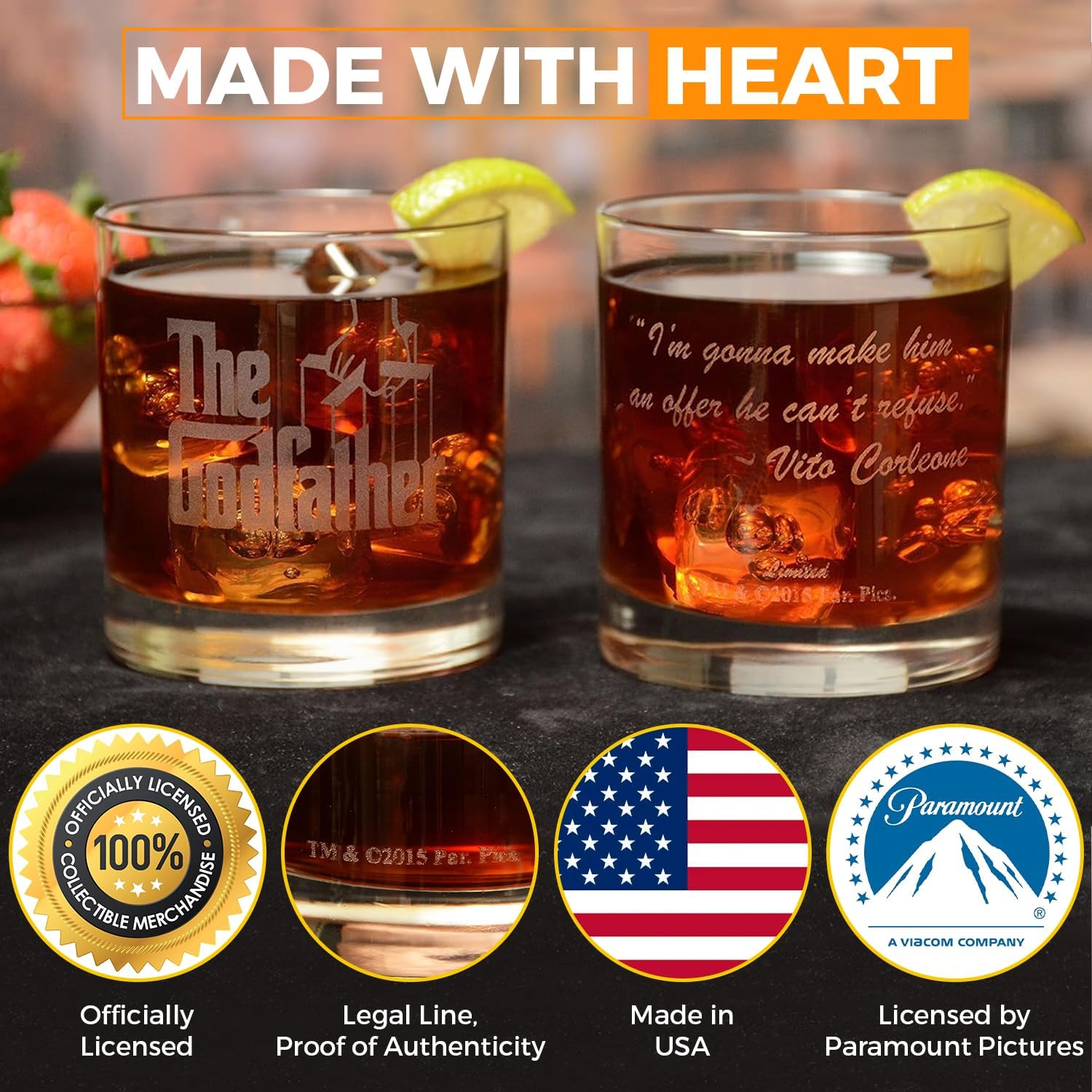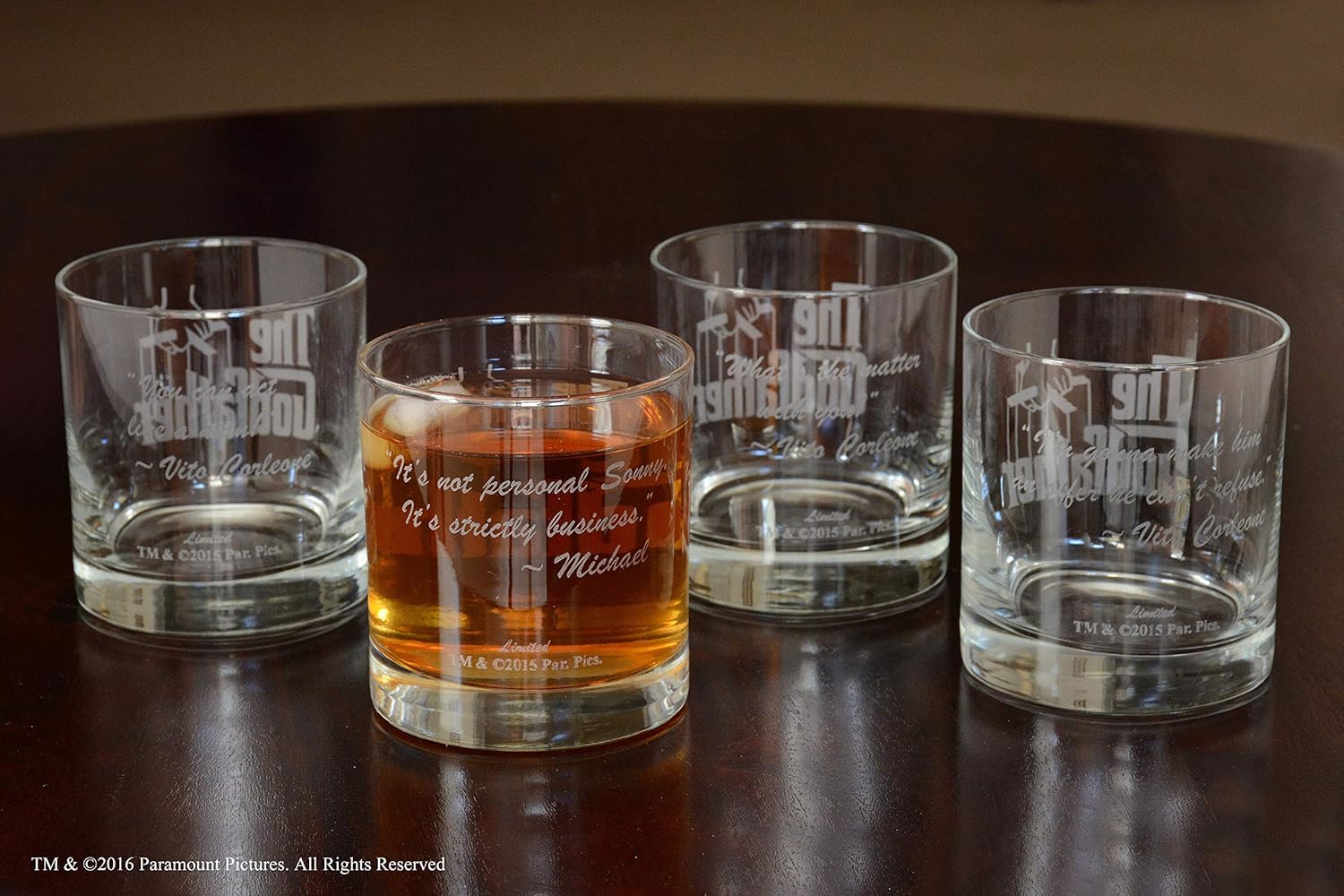 - THE GODFATHER THEMED COLLECTIBLE: Our rocks glass set features the iconic THE GODFATHER logo on the front & 4 unique quotes etched on the back of glasses. This custom whiskey glass set captures the essence of the film, making it a functional homage for enthusiasts who seek a unique addition to their collection